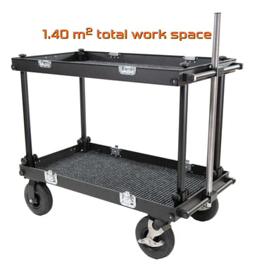 La plus grande de la gamme chez FilmCart, elle permet de transporter un maximum de flycases caméras, sacs assistants et accessoires, avec ses 1,40m2 de surface totale de plateaux et ses 250kgs de capacité de charge. Elle reste cependant maniable par ses dimensions ergonomiques.
