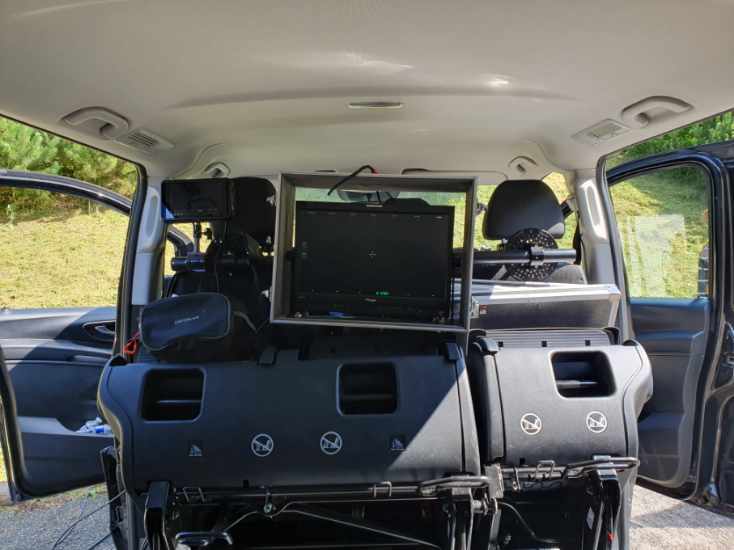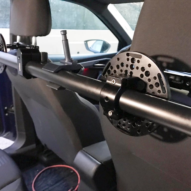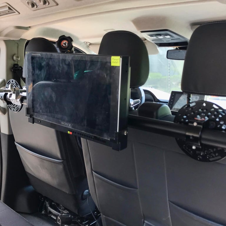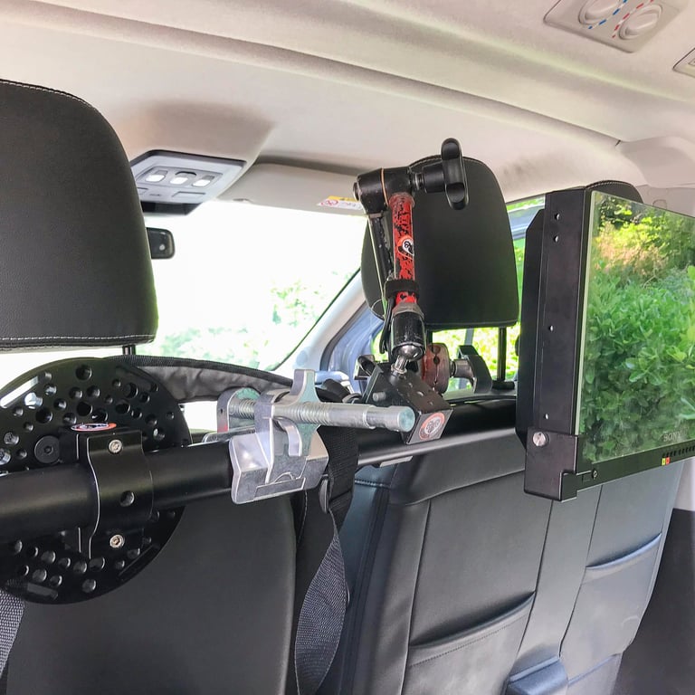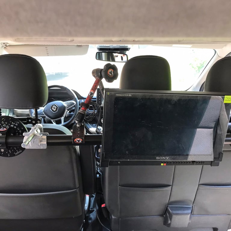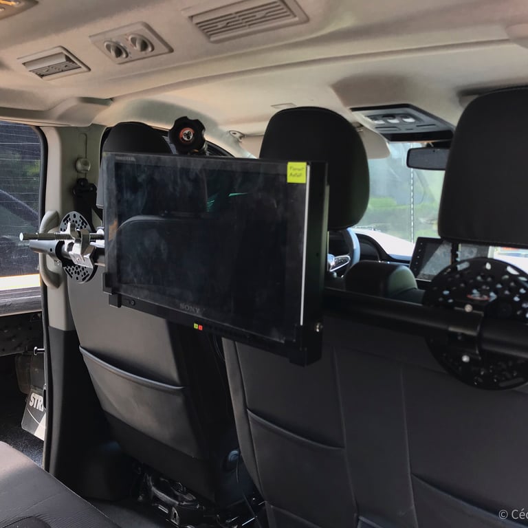 Système de support moniteurs avec possibilité d'y fixer un écran 17" et de un à deux supplémentaires plus petits de 7 à 9" . Pratique quand il faut équiper une voiture ou Van suiveur pour la mise en scène ou Directeur Photo.